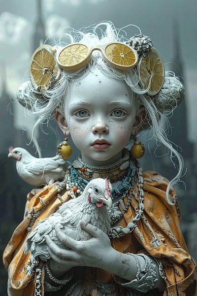 Een bijzonder en mooi jong meisje, een porseleinachtige huid, breekbaar en apart. Lijkt op een standbeeld, maar is het niet, met het fruit in haar witte haren en haar grote ronde zonnebril op haar hoofd met in de glazen sinaasappelschijfjes. De kip op haar schouder en de kip in haar handen zijn haar vriendjes. Oranje en geel zijn haar…