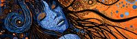 Moderne Abstracte Kunst | Oranje Blauw - Dit artistieke stuk balanceert tussen abstract en figuratief met een golf van kobaltblauwe en oranje tinten, onderbroken door stippen van pure witheid. De geschilderde gezichtscontouren en het patroonwerk zijn dynamisch en nodigen uit tot een eigenzinnige interpretatie.