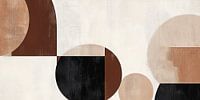 Dit abstracte kunstwerk straalt rust en balans uit door geometrische vormen in warme, aardse tinten. Cirkels en vierkanten in bruin, zwart en beige vormen een harmonieuze compositie tegen een lichte achtergrond. Subtiele texturen geven diepte, terwijl het contrast tussen ronde en rechte vormen spanning creëert. Het minimalistische ontwerp nodigt uit tot contemplatie over de schoonheid van eenvoud en de dialoog tussen vorm en kleur in moderne abstractie.