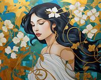 Moderne Art Nouveau - Het kunstwerk vertoont een stilistisch portret van een vrouw omgeven door bloeiende bloemen, waarschijnlijk dogwood-bloesems, met gouden en turquoise accenten die een vleugje elegantie en sereniteit toevoegen. De stijl lijkt een moderne fusie van Art Nouveau-invloeden met vloeiende lijnen en een harmonieuze…