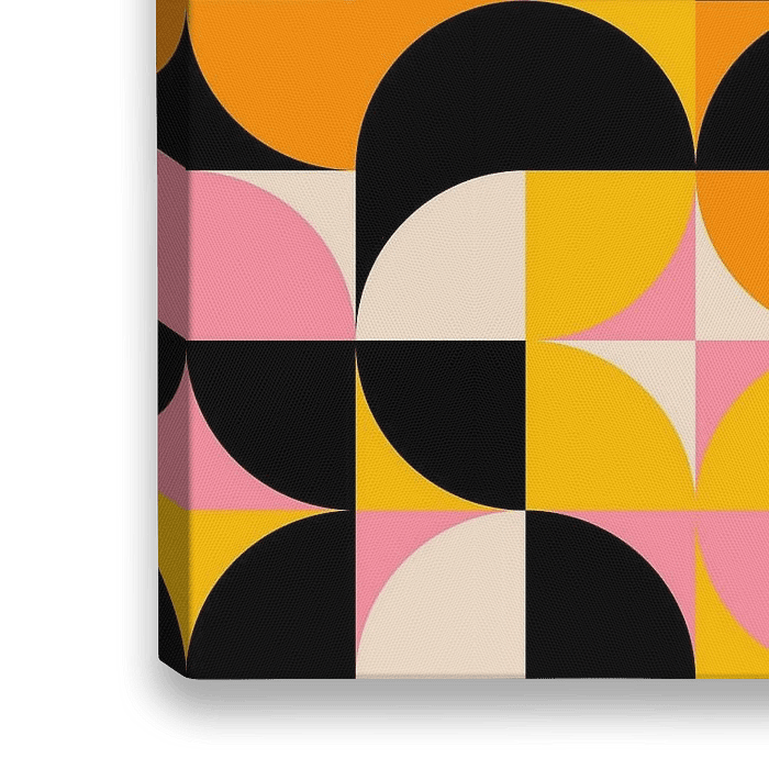 Koop dit abstracte kunstwerk Moderne Bauhaus vormen Geel Roze Perzik van Mad Dog Art op canvas, aluminium dibond, (ingelijste) fotoprint, behang en ArtFrame, op maat geprint in Fine-Art kwaliteit.