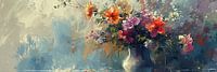 Moderne Bloemenvaas - Op dit levendige doek vangen impressionistisch neergezette bloemen in een vaas de kijker met hun speelse dans van oranje, roze en witte tinten, omgeven door groene accenten die rusten tegen een zachtblauwe achtergrond. De losse penseelstreken en de gedurfde verfklodders voegen een moderne draai toe aan dit…