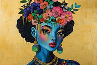 Moderne Bloemenvrouw - Dit kleurrijke vrouwenportret toont een jonge vrouw met een rijke bloemenkroon en gouden sierraden tegen een gouden achtergrond, uitgevoerd in een levendige en moderne stijl.