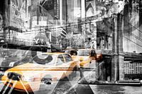 Times Square is wereldberoemd en vormt het centrum van de Broadway theaterwijk van New York City. Een moderne en decoratieve compositie van een stedelijk straatbeeld uit Manhattan en de Brooklyn Bridge en omgeving.