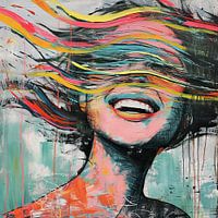 Moderne Kunst Portret - Dit levendige, expressieve portret valt op door zijn dynamische penseelstreken en het gebruik van kleur, waar strakke, golvende lijnen een gevoel van beweging creëren. De achtergrond bestaat uit een mix van koelere en warmere tinten, waarbij het gezicht energiek naar boven kijkt, wat een uitgelaten stemming…