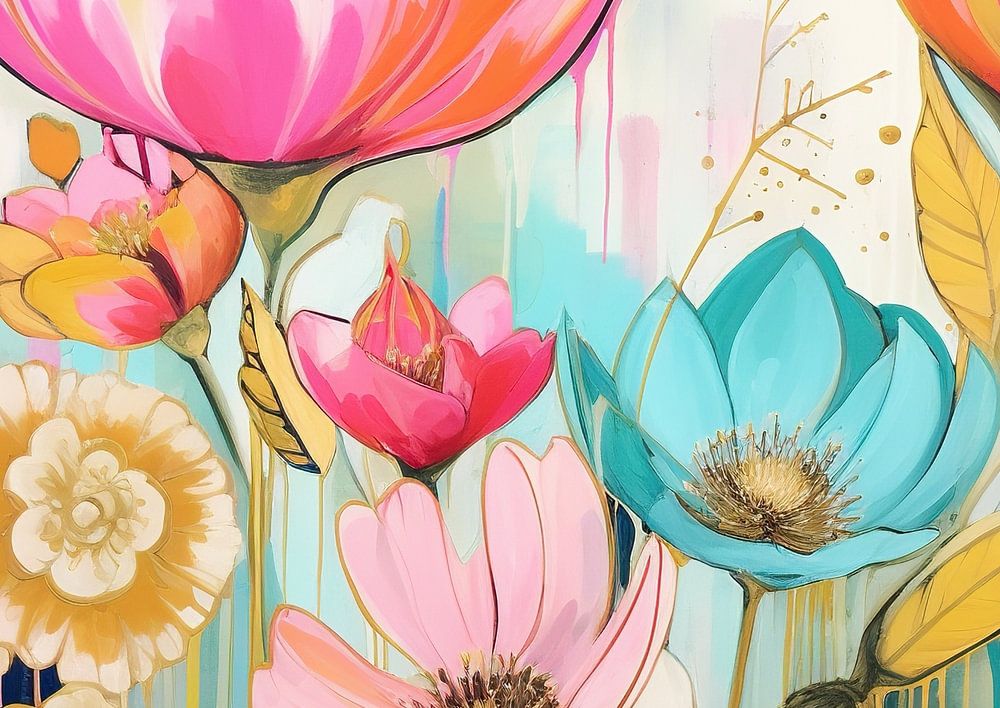 Moderne Lotus Dans - Dit levendige schilderij brengt florale pracht tot leven met uitgesproken bloemen, waaronder de kenmerkende lotus, tegen een achtergrond met zachte pasteltinten. De stijl lijkt een moderne, speelse twist te geven aan traditionele bloemenschilderkunst, met een uitbundig kleurenpalet dat roze, blauw en geeltinten combineert, aangevuld met accenten van goudverf voor een luxe touch.
