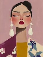 Deze illustratie toont een stijlvol portret van een vrouw met gesloten ogen en een serene uitstraling. Ze heeft zwart haar in een middenscheiding, rozerode wangen en opvallende rode lippen. Ze draagt elegante witte kwastoorbellen die mooi contrasteren met haar getinte huid. De vrouw is gekleed in een kleurrijke outfit met een bordeauxrode sectie links, een goudgele strook in het midden en een wit gedeelte met blauwe bloemmotieven rechts. De achtergrond is in een zachte lavendelroze tint die het geheel harmonieus afmaakt.