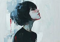 Moderne Portret - Dit moderne schilderij toont een expressief portret van een persoon met een krachtige uitstraling, gekenmerkt door een dynamische mix van brede penseelstreken in zwart en wit met opvallende rode accenten op het gezicht.