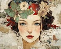 Moderne Rococo Vrouwenportret - Dit vrouwen schilderij toont een serene vrouw met een kroon van levendige, natuurlijke bloemen en bladeren, uitgevoerd in een moderne Rococo-stijl met een gedetailleerde textuur en subtiele aardetinten.