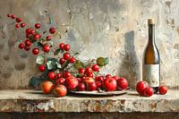 Een prachtig stilleven schilderij waarin een weelde van kleurrijk fruit en een verfijnde fles wijn op een rustige en harmonieuze wijze worden gepresenteerd. De levendige kleuren en de zorgvuldig gearrangeerde compositie vormen een uitnodigend tafereel dat de kijker uitnodigt om de details van het kunstwerk te verkennen en te waarderen.