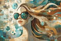 Moderne Vrouw Portret - Dit vrouwen schilderij toont een moderne, vrolijke vrouw met grote zonnebrillen, omgeven door abstracte, zwevende bollen en dynamische wervelende lijnen in aardse en blauwe tinten.