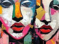 Moderne Vrouwenschilderij | Bold Strokes of Femininity - Dit moderne portretschilderij toont twee gestileerde vrouwengezichten, die symmetrisch zijn geplaatst tegen een achtergrond van levendige en abstracte verfstreken. De gezichten zijn opgebouwd uit grote, expressieve elementen, waarin de ogen, neuzen en vooral de lippen prominent…