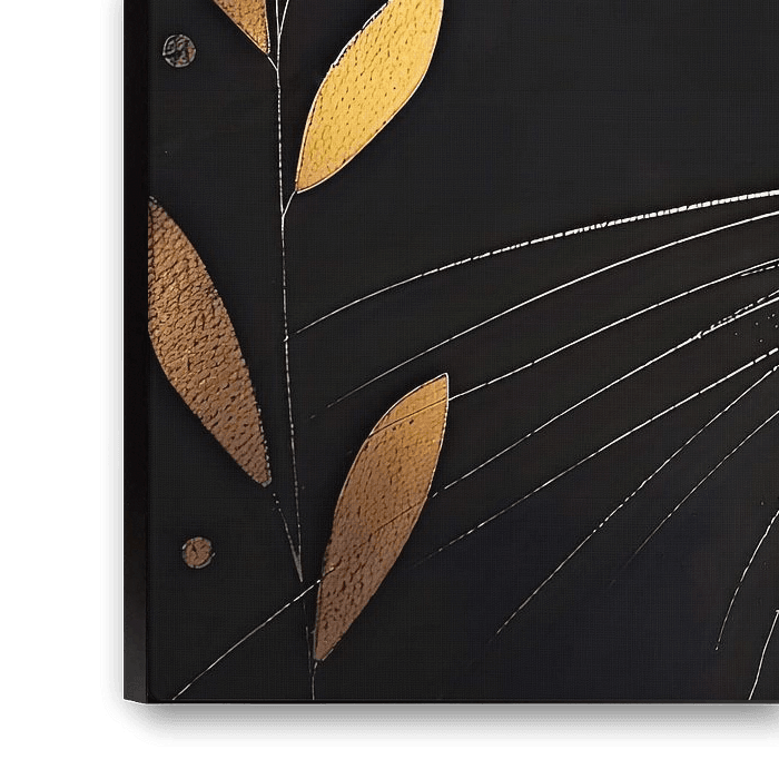 Een stijlvolle illustratie van een zwarte kat, weergegeven tegen een contrasterende achtergrond van zwart en wit met subtiele textuur. De kat heeft een elegante en mysterieuze uitstraling, met gouden bladeren en lijnen die het kunstwerk een luxe en verfijnde sfeer geven. Perfect voor moderne interieurdecoratie en kunstliefhebbers die op zoek zijn naar iets unieks voor aan de muur in hun huis of werkruimte.