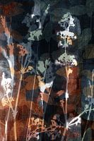 Abstract kunstwerk met bloemen- en plantenmotieven in rijke blauwe, roestbruine en groene kleuren. Uniek en levendig kunstwerk, ontworpen om een gevoel van warmte, zachtheid en organische schoonheid op te roepen.