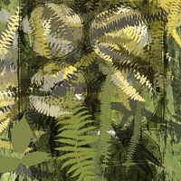 Moderne abstracte mixed media botanische kunst.Varensbladeren, organische vormen, roestige metalen texturen creëren moderne abstractie.Industrieel, Retro, Design, Urban Jungle, Scandinavisch, Boheemse interieurstijl.
