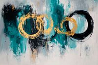 Dynamische, levendige cirkels ontvouwen zich in een harmonieus samenspel van diepzwart, stralend goud en zachte aquatinten. Deze compositie straalt elegantie en moderniteit uit en is perfect voor een stijlvolle woonkamer, waar het een fascinerende blikvanger creëert en de sfeer tot leven brengt.