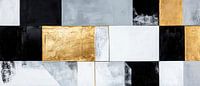 Er ontvouwt zich een fascinerend samenspel van elegant zwart, stralend wit en fonkelend goud. De geometrische patronen creëren een moderne, dynamische sfeer die zowel stijlvol als tijdloos is. Dit kunstwerk voegt een exclusief tintje toe aan de woonkamer en trekt ieders aandacht. Perfect voor iedereen die elegantie en creativiteit waardeert.