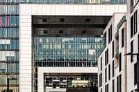 Bijna abstracte vormgeving door in te zoomen op de moderne architectuur in de wijk Zollhafen in Keulen (Duitsland).