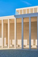 Deze foto is van een deel van de zijvleugel van de James-Simon-Galerie aan de Bodestrasse in Berlijn. Mooie schaduwlijnen door het vroege zonlicht. Betonnen palen waarvan de structuur ook op de foto nog goed zichtbaar is. Het bankje tegen de muur dat het ritme van de lijnen goed onderbreekt en daarmee een dimensie aan de foto toevoegt.…