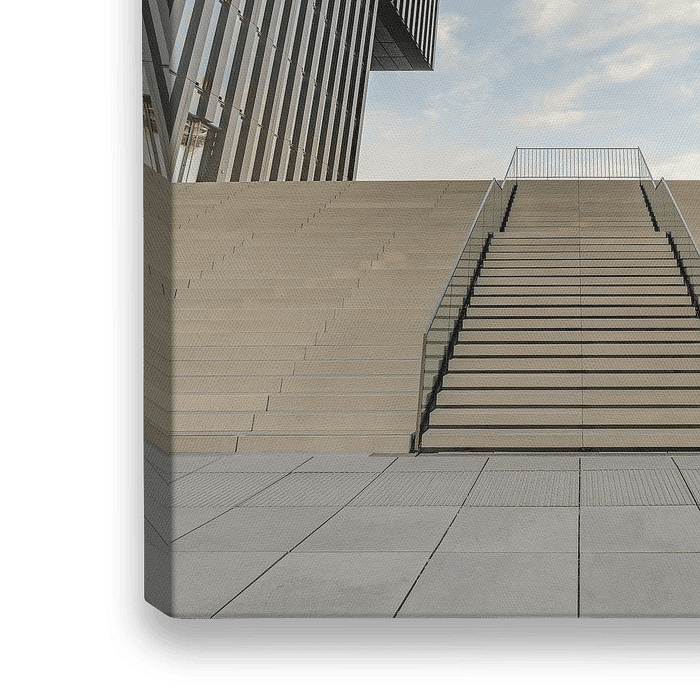 Trappen tussen twee wolkenkrabbers in de mediahaven van Düsseldorf.