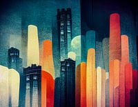 Een mengeling van moderne abstract verlichte wolkenkrabbers en historische gebouwen in de gloed van de volle maan. Verschillende schilder- en patchworktechnieken werden in combinatie gebruikt om dit kunstwerk te creëren. De differentiatie van de kleuren, felle kleuren voor de silhouetten van de wolkenkrabbers van de moderne stad, donkerdere kleuren voor de gebouwen van de historische stad, zorgt voor nog meer contrasten in het beeld naast de historische kenmerken nieuw en oud.