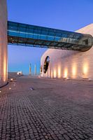 Gebouw in moderne architectuur van de Champalimaud Foundation in Lissabon gefotografeerd op het blauwe uur.