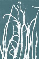 Monotype print van weidebloemen en planten in prachtig groenblauw en wit.