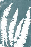 Monotype print van weidebloemen en planten in prachtig groenblauw en wit.