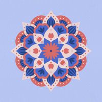 Abstracte bloemenmandala met oranje-rode en blauwe vibes.