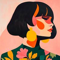 Het silhouet van een elegante vrouw ontvouwt zich in een harmonieuze kleurencombinatie van levendige tinten en zachte pasteltinten. Haar mysterieuze gelaatstrekken worden geaccentueerd door grote, opvallende oorbellen, terwijl weelderige bloemenpatronen op haar jurk een gevoel van levendige frisheid creëren. Het speelse contrast tussen…