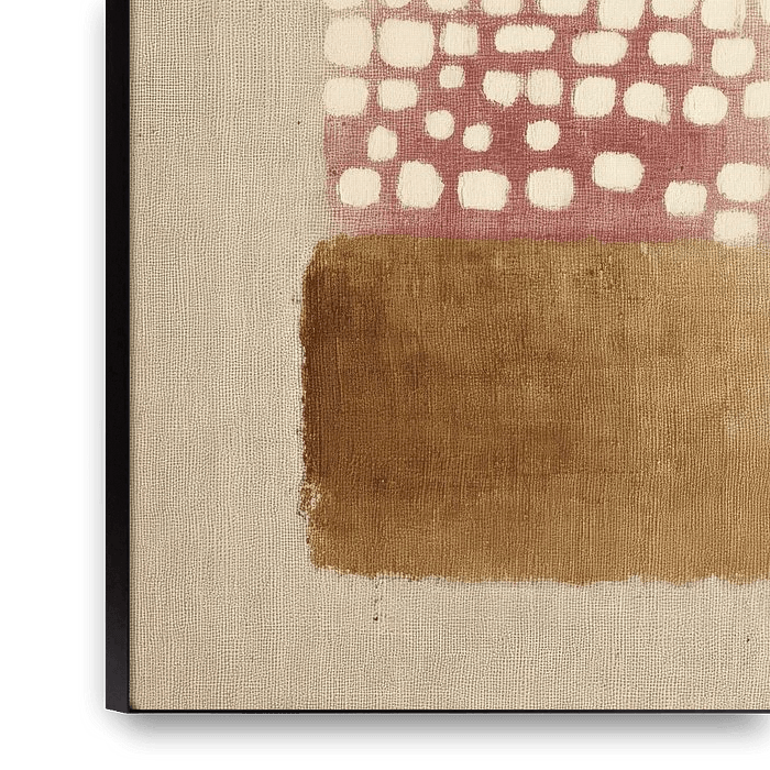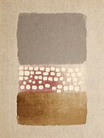 Dit abstracte kunstwerk brengt drie zachte kleurvlakken samen tot een harmonieuze compositie die rust uitstraalt. Een koele taupe-grijze rechthoek bovenaan vormt een serene basis, terwijl het midden oplicht door een speelse laag van lichtroze tinten met handgeschilderde witte stippen. Onderin zorgt een warme okergele strook voor aarde,…