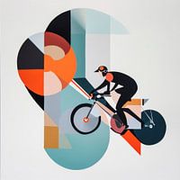 Een dynamisch samenspel van geometrische vormen en gedurfde kleuren ontvouwt zich als een gestileerde fietser met verve over het doek glijdt. De rood-oranje accenten geven de beweging levendigheid, terwijl de koele, abstracte achtergrond een moderne frisheid uitstraalt. Een harmonieus samenspel van activiteit en kunst.