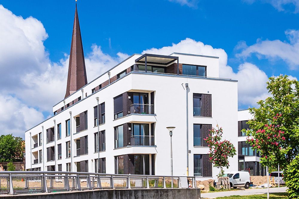 Moderne gebouwen en Petrikirche in de Hanzestad Rostock.