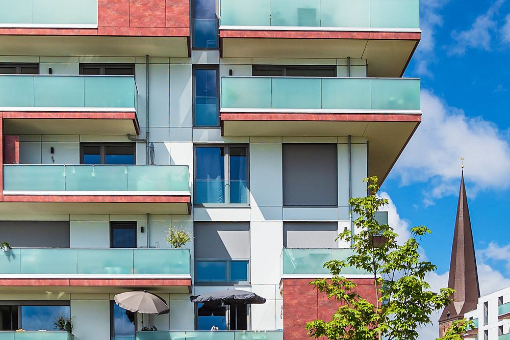 Moderne gebouwen en Petrikirche in de Hanzestad Rostock.