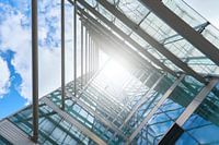Deel van de glazen gevel van een modern kantoorgebouw in het centrum van Berlijn met uitzicht naar boven in verblindend zonlicht in de zomer