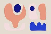 Moderne, hippe collage met geometrische en organische vormen in mooi op elkaar afgestemde kleuren. In blauw, roze, (licht) oranje en (mosterd) geel. Goed uitgebalanceerde compositie. Speels en modern.