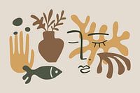Moderne, hippe collage met geometrische en organische vormen in mooi op elkaar afgestemde kleuren. Aardetinten. Compositie van een vaas met takken, een vis, een hand, gezicht en abstracte vormen.