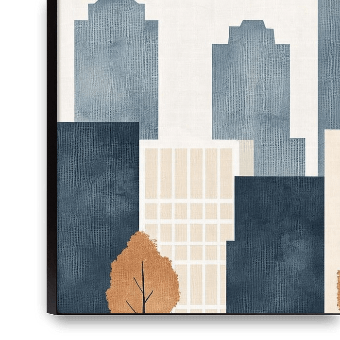 Dit prachtige minimalistische ontwerp toont een serene stadsgezicht met subtiele herfstkleuren en zachte vormen. De skyline van gebouwen wordt harmonieus aangevuld door de aanwezigheid van eenvoudige bomen, wat een rustgevende balans tussen stedelijke en natuurlijke elementen creëert. Perfect als decoratieve toevoeging aan moderne…