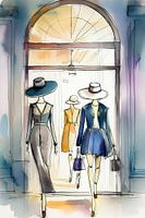moderne mode, tekening, kleurrijk, etalage, jurk, rok, jas, hoed, winkelen
