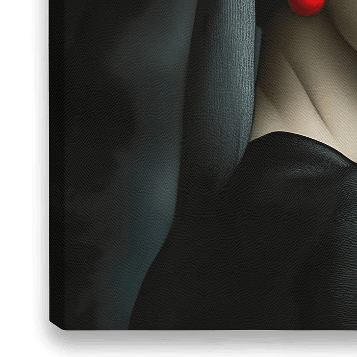 Een hedendaagse herinterpretatie van Vermeer's iconische "Meisje met de Parel". Het meisje, met haar intense blik recht in de camera gericht, daagt de toeschouwer uit met een mengeling van mysterie en…