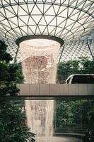 Deze foto toont de majestueuze waterval op Jewel Changi Airport in Singapore, een van de meest indrukwekkende stedelijke natuurwonderen ter wereld. Warm licht valt door het geometrisch gestructureerde glazen dak op het vallende water, dat harmonieus opgaat in de weelderige tropische tuin. Op de voorgrond kruist een monorailbrug het landschap en maakt het beeld van innovatie en nabijheid tot de natuur tegelijkertijd compleet. Jewel Changi Airport is een uitstekend voorbeeld van moderne architectuur, duurzame stadsplanning en de combinatie van technologie en groene ruimtes. Reizigers en bezoekers genieten van de verfrissende sfeer, de verscheidenheid aan planten en de unieke waterval die het middelpunt vormt van het winkel- en belevingsgebied. De opname is ideaal voor liefhebbers van architectuurfotografie, natuurmotieven en stedelijke oases. Het benadrukt op indrukwekkende wijze de flair van Singapore, de schoonheid van botanische tuinen en de vooruitgang van moderne steden en is perfect als inspirerende wanddecoratie.