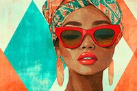 Een stralend portret vol levensvreugde dat inspireert met zijn felle kleuren en elegante uitstraling. De rode zonnebril en kunstig geknoopte sjaal geven het portret een vleugje glamour. Ideaal voor in de woonkamer, waar het een uitnodigende sfeer creëert als uitdrukking van stijl en persoonlijkheid.