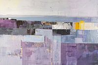 Dit prachtige kunstwerk toont een moderne skyline die opvalt door zijn kleurrijke blokken en abstracte vormen. Het samenspel van paarse, grijze en witte tinten creëert een unieke en sfeervolle weergave van een stad aan de horizon. Dit ontwerp is perfect voor liefhebbers van moderne kunst en geeft een stijlvolle en eigentijdse…