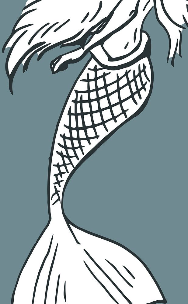 Zeemeermin ontwerp in drie kleuren, grijsblauw, wit en donkerblauw. Mooie illustratie voor een eigentijds interieur.