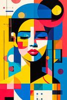 Portret van een vrouw, in felle kleuren, in de stijl van Bauhaus. Met haar gesloten ogen ziet het er dromerig en sereen uit en straalt het rust uit, ondanks de felle kleuren. Het beeld is met behulp van ai gegenereerd.