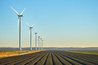 Mooi perspectief met de horizon, akker en de aflopende lijn met de windturbines. Foto is genomen in de altijd romantische Flevopolder, Flevoland