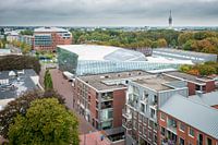 Na de niet geheel comfortabele beklimming van de Adventskerk, werd de beloning gevormd door vrije uitzichten over Alphen aan den Rijn in alle vier de windstreken. Deze foto geeft en overzicht van de totale renovatie van het centrum aan de Hoge Zijde van de stad. Van dit standpunt een mooie combinatie van ronde lijnen, en strakke rechthoekige vormen.