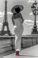Vrouw met rode schoenen voor de Eiffeltoren in zwart-wit met colourkey: Een elegante vrouw poseert voor de iconische achtergrond van de Eiffeltoren. Haar outfit is klassiek zwart en wit, terwijl haar opvallende rode schoenen opvallen dankzij het colourkey-effect. De contrasten tussen de tijdloze elegantie en de moderne kleurspatten…
