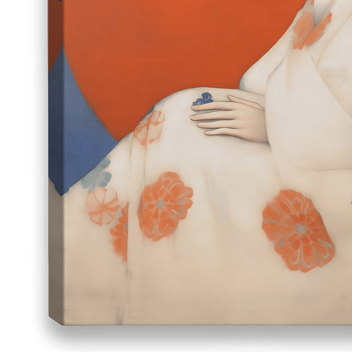Portret van een bescheiden Japans meisje in gebloemde kimono met een grote rood oranje zon en blauwe kubistische achtergrond.