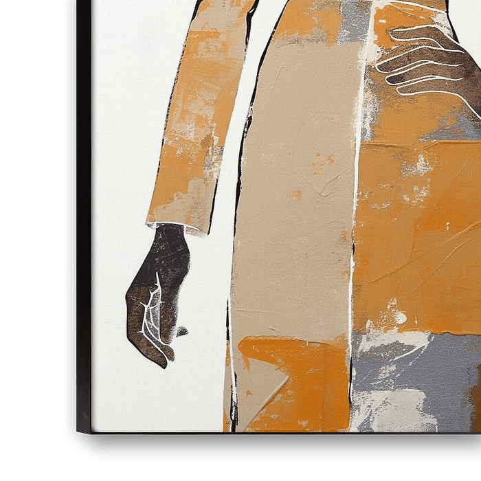 Modevrouw - Dit vrouwen schilderij toont een silhouet van een elegante dame, gekleed in een jurk en hoed met een collage van pastel- en aardetinten, die een sterk gevoel van stijl en vintage mode uitstraalt.